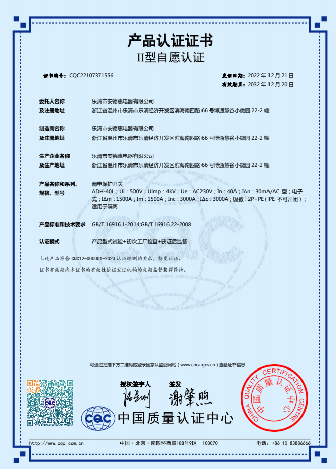 漏電保護(hù)開關(guān)CCC證書